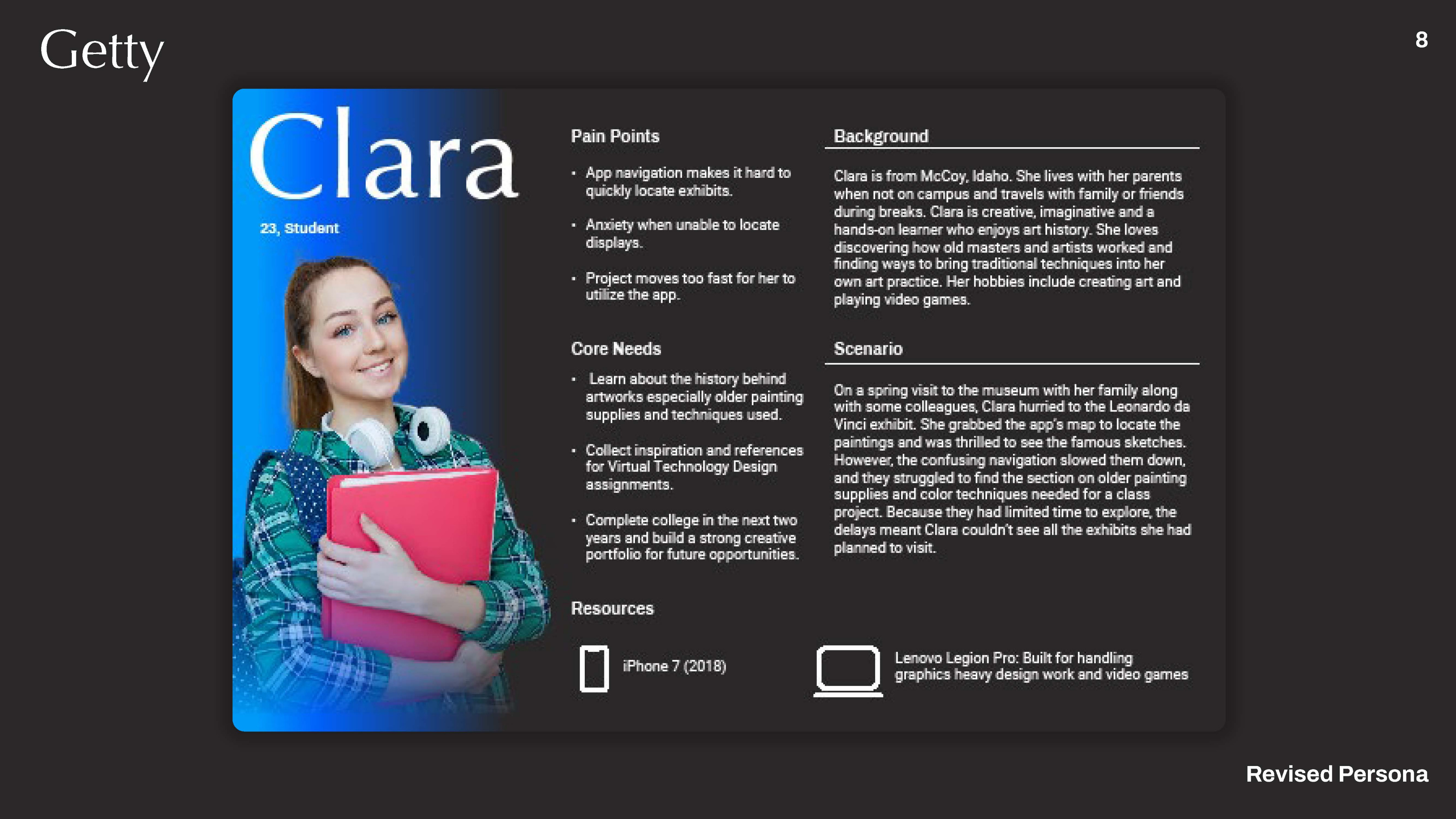 Over the course of about a month and a half, I worked with a team to create a museum app redesign for the Getty. My role in this was a UI developer, I prototyped and created screen designs in Adobe XD with another team member. We had some file version compatibility issues that eventually slowed us down, leading our full UX design group to transfer to Figma for later projects. We documented this entire process, showing our evolution of persona research. This work is speculative.