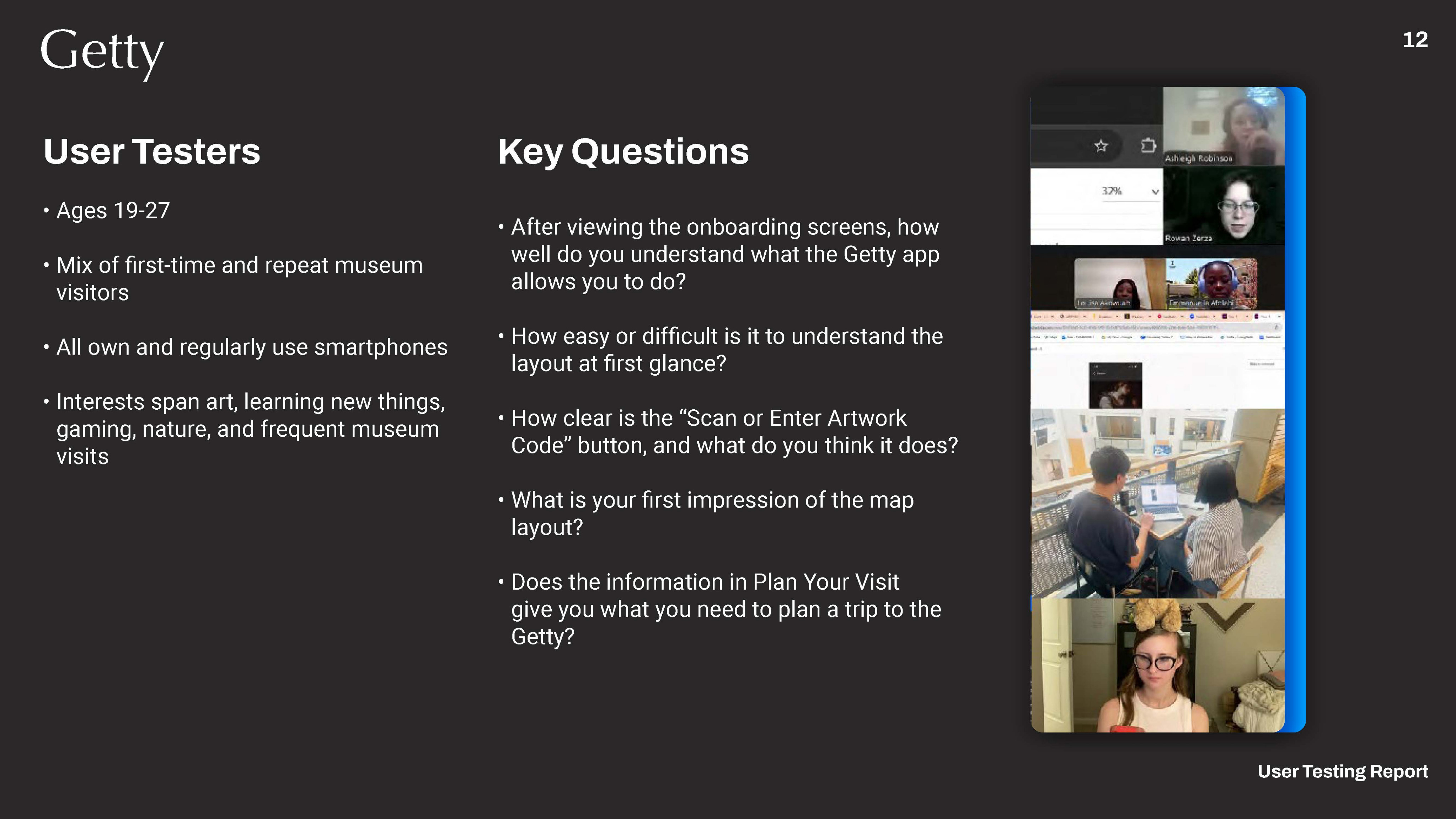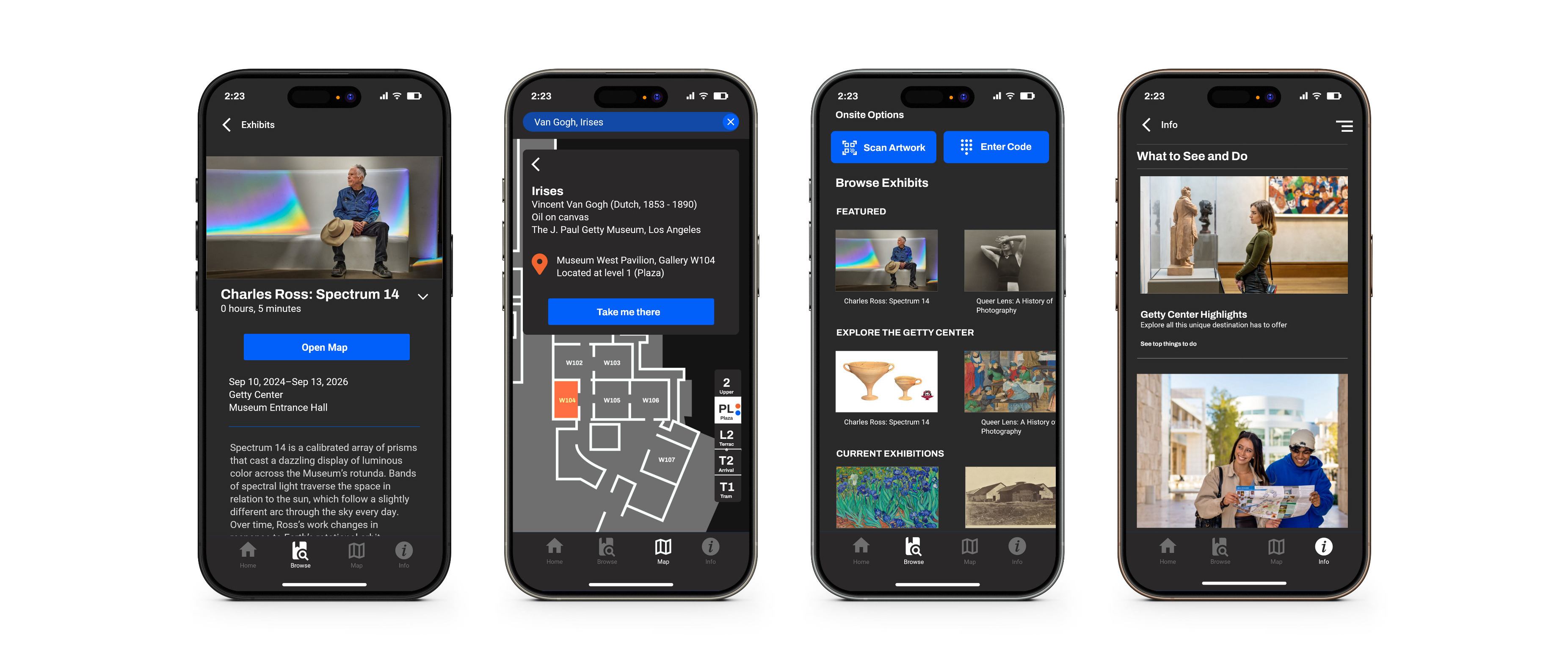 In our user tests, we had group interviews as well as scripts to read from. We found out users were getting hung up on QR Code scanning and wanted more navigation features. Users also pointed out some un-intuitive file locations, ex. expecting Plan your Visit under Home, not Info.